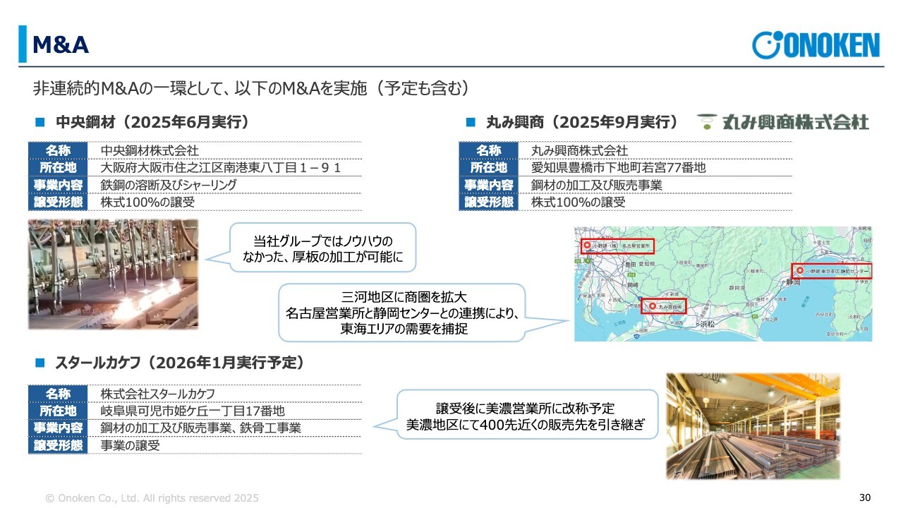 また、今回発表しましたスタールカケフの鉄鋼部門については、来年1月末に事業譲渡を受ける予定となっています。この会社は、岐阜県東濃地区で鋼材加工および販売事業、鉄骨工事を行っている企業です。一方、当社は岐阜営業所を構えているものの、倉庫や加工設備を持っていません。