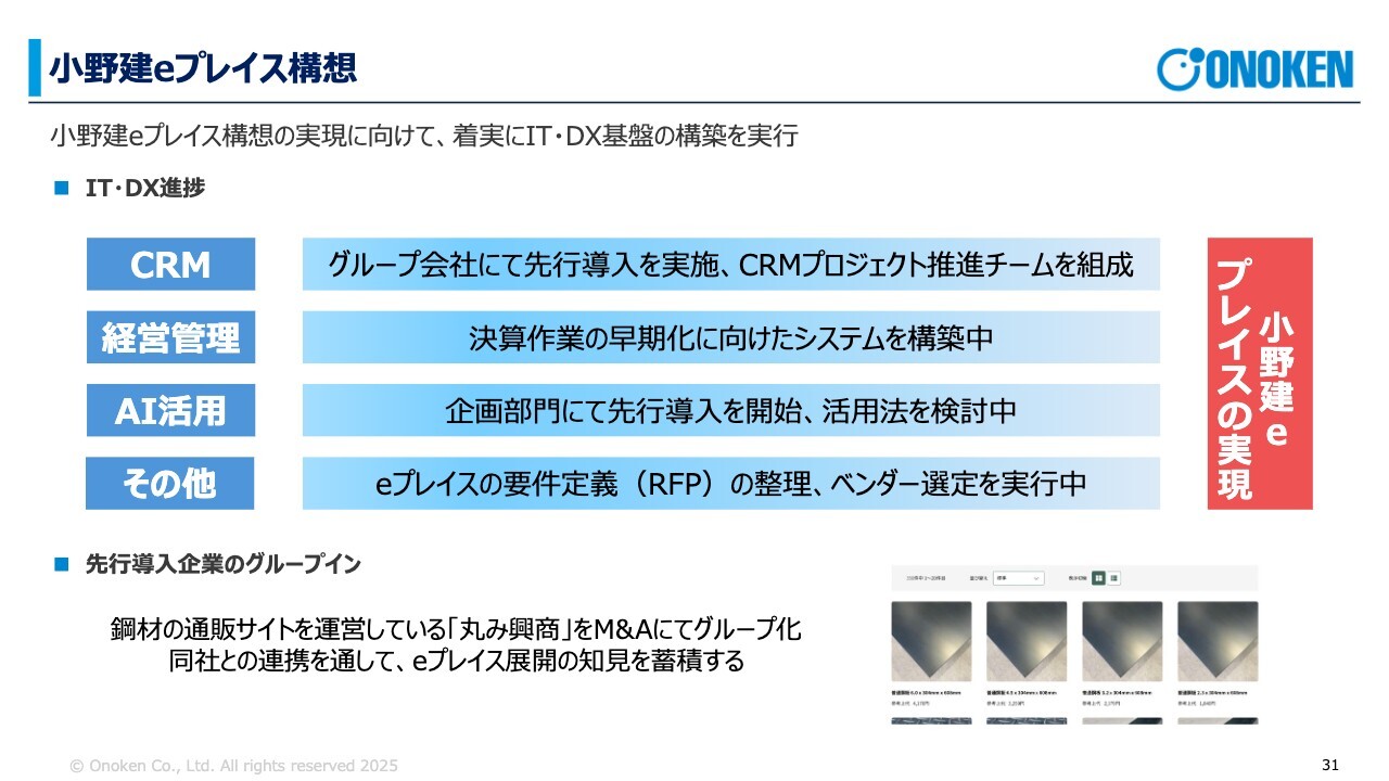 次に、「小野建eプレイス構想」についてご説明します。この構想では、弊社内で鉄鋼の「Amazon」を作ることを1つの大きな目標として掲げています。