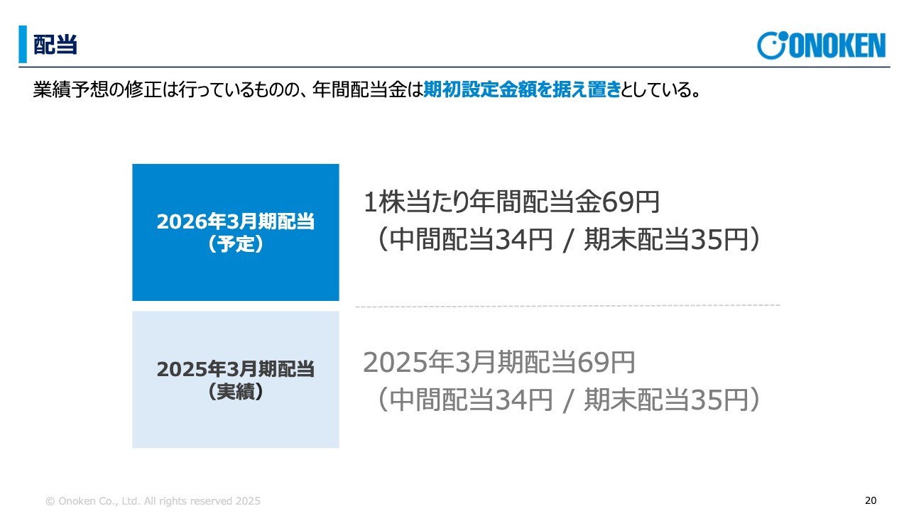 配当についてですが、別紙に記載のとおり、期初より下限を69円に設定しています。この配当金下限を据え置き、年間配当金69円を予定しています。