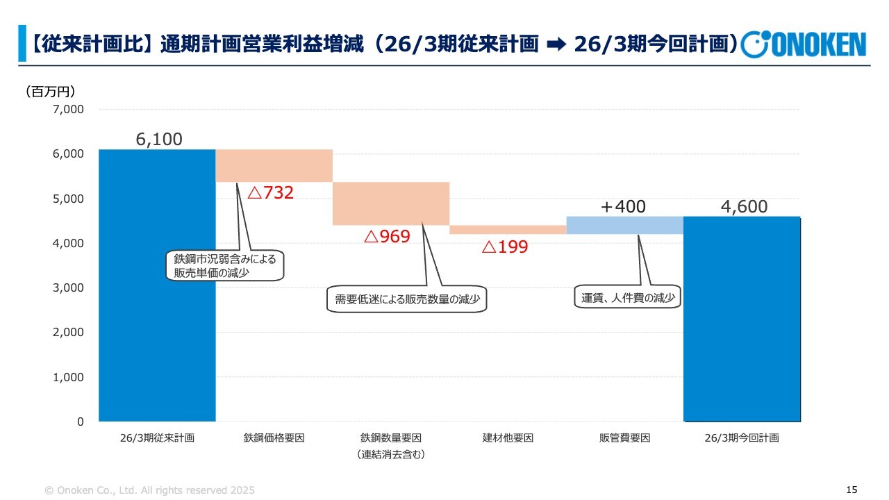 従来計画比において、上期の影響が大きく残っており、鉄鋼商品に関する価格や数量のマイナスが、今回の修正の大きな要因となっていると考えています。