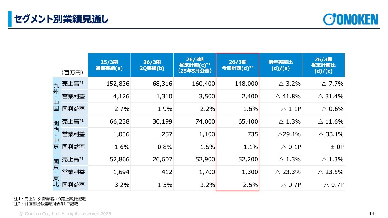 次に、セグメント別の業績推移についてご説明します。当社はセグメントを3つの地域に分けて表示しています。1つ目が九州・中国、2つ目が関西・中京、3つ目が関東・東北と、3つのブロックに分けてセグメントを表示しています。