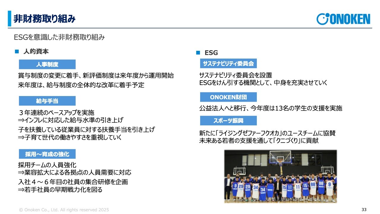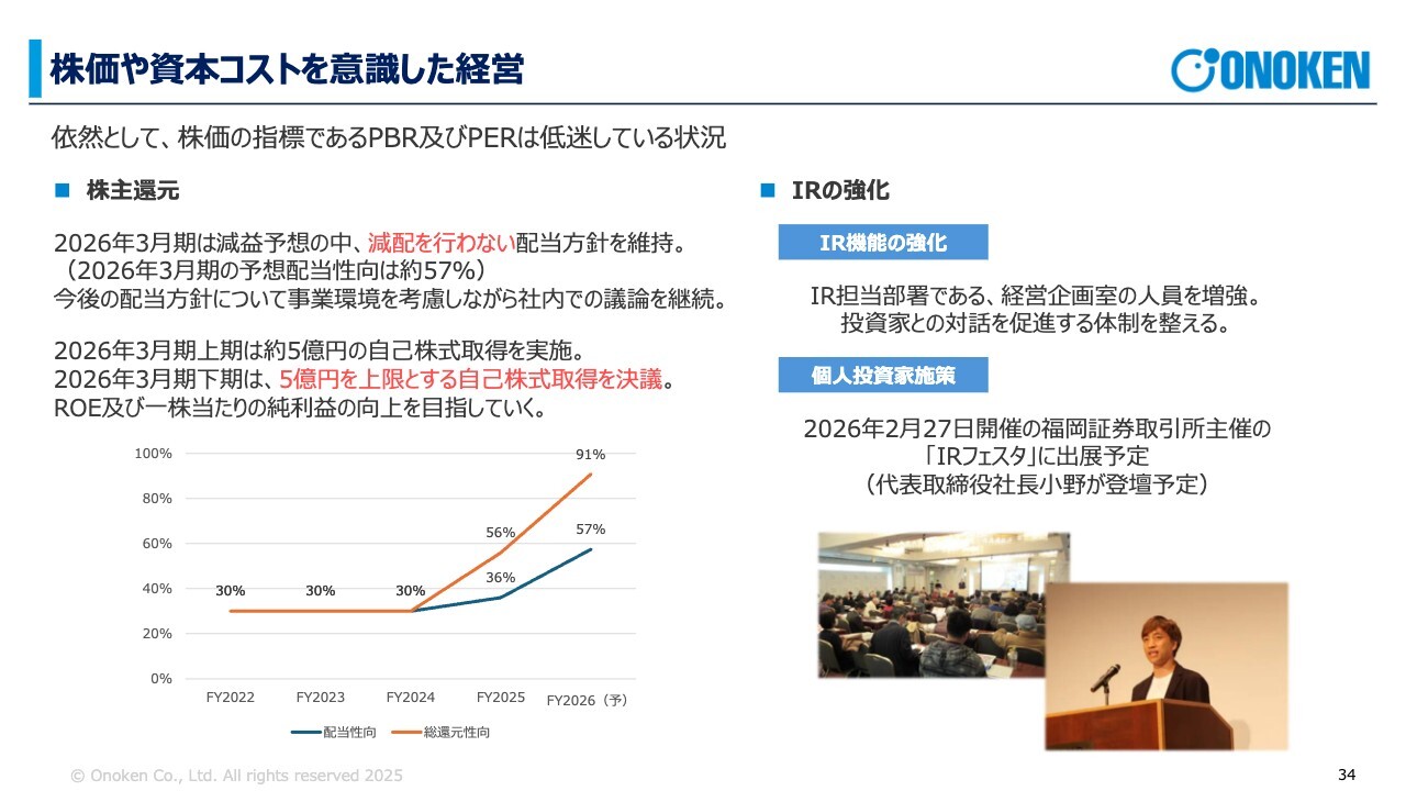また、IR強化の一環として、経営企画室の人員を増員しています。機関投資家のみなさまだけでなく個人投資家のみなさまにも積極的に当社の株をご購入いただきたいとともに、当社のファンになっていただきたいと考えています。そのため、2026年2月末に福岡証券取引所が主催するIRフェスタに参加予定です。そこで個人投資家のみなさまに対して私自身が直接説明を行い、さらに多くのファンを増やしていきたいと考えています。