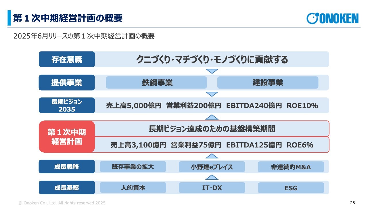 第1次中期経営計画は、2035年の長期ビジョンを実現するためのステップの1つです。今年度を含めた3ヶ年計画として考えており、数字の部分も重要ですが、この3年間は長期ビジョン達成のための基盤を構築する期間として設定しています。