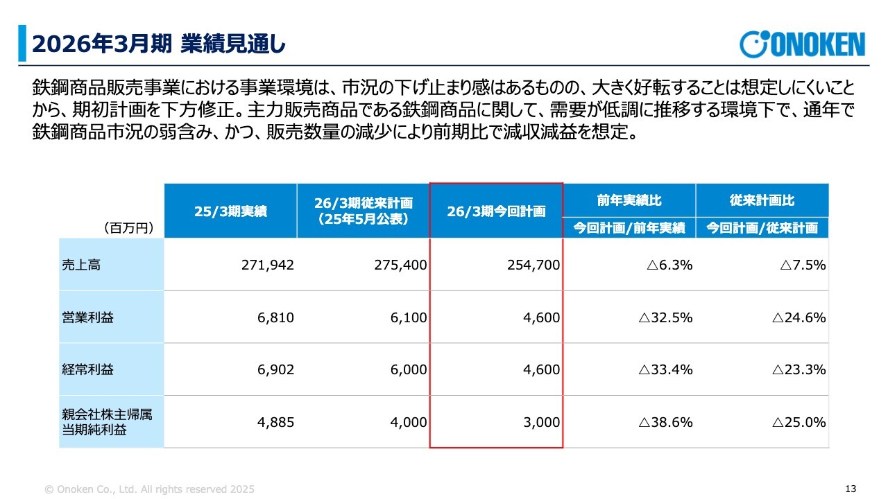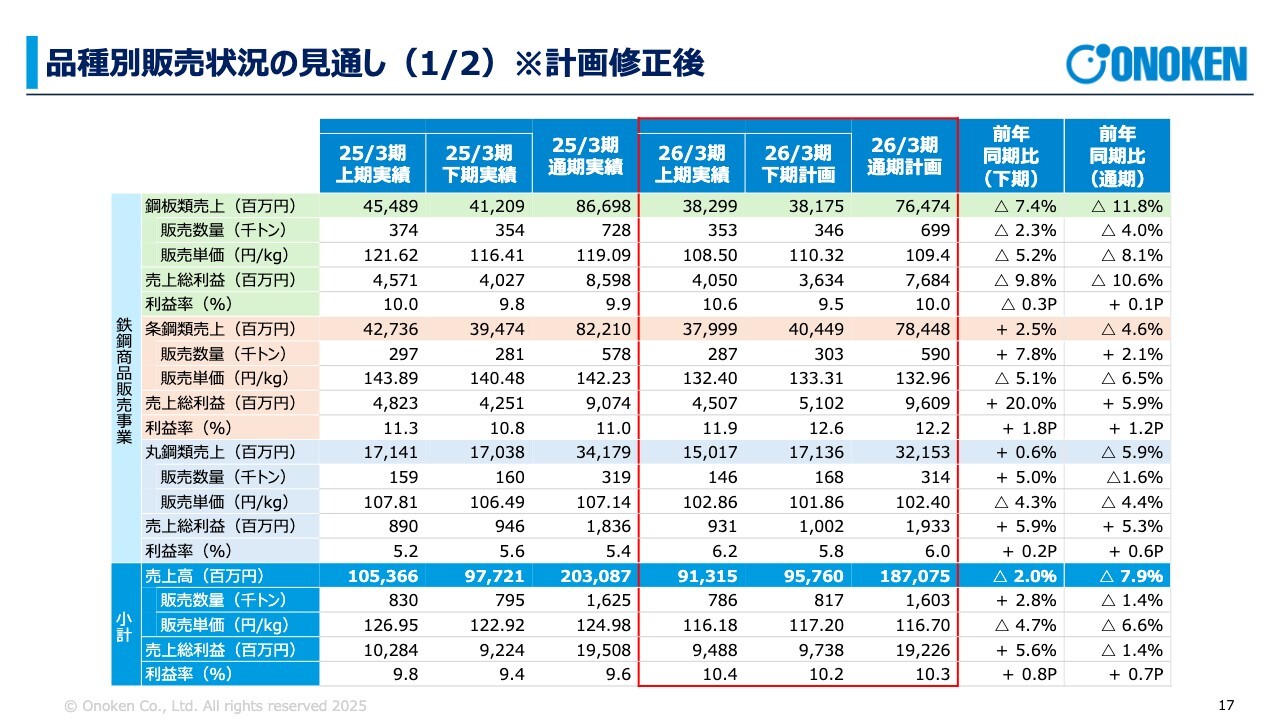 先ほど述べたように、市況には下げ止まりの兆しが見られ、鉄鋼商品のスプレッドは徐々に広がりつつあります。ただし、販売数量が大きく改善するかといえば、現時点ではそうした景況感はまだ見られません。そのための修正となります。