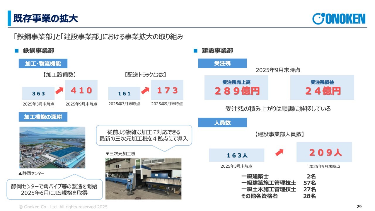 建設事業部についてですが、受注残の売上高が非常に好調に推移しています。利益もある程度見通すことができる状況です。人員に関しては増強を進めており、資格取得者も増加しています。これにより、ゼネコン各社からより高く評価していただける体制作りを強化している最中です。