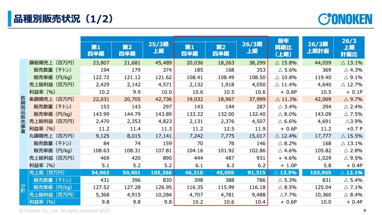 ご注目いただきたいのは利益率です。一番下の小計部分をご覧いただくと、販売数量については先ほどご説明したとおり、上半期では前期83万トンでしたが、今期は78万6,000トンと減少しています。しかしながら、利益率は徐々に改善しています。
