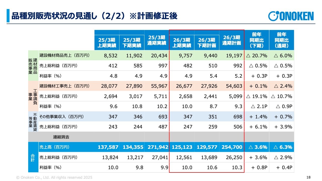 また、工事請負や建材に関しては、若干の業務のずれ込みや土木製品の建材の納期の問題が影響しています。受注残は確保しているものの、売上高に増減が生じることが見込まれるため、それを考慮した修正です。