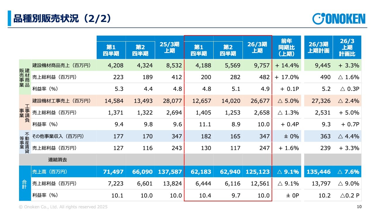 もう1つの柱である建材販売事業および工事請負事業については、現在受注している大型工事物件の進捗が元請などの影響により、若干遅れて推移しているのが現状です。それに伴い、予算対比でも若干ながら売上の進捗が遅れていると考えています。