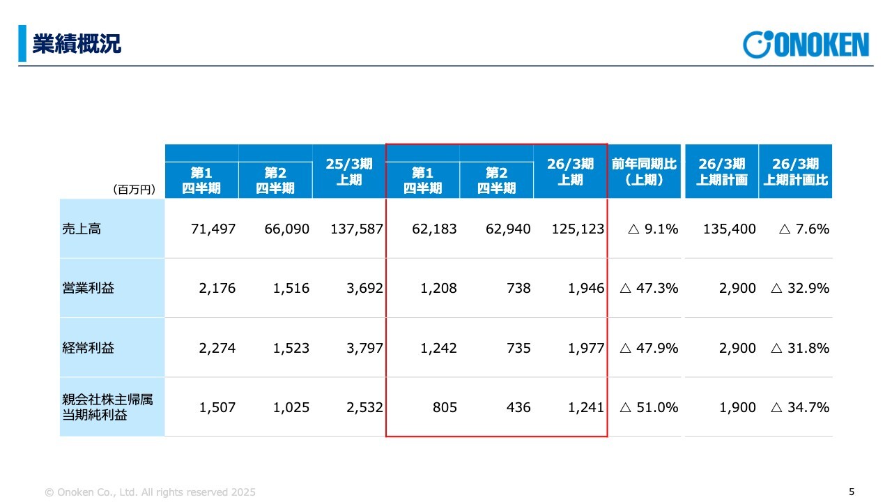小野哲司氏:小野建株式会社代表取締役専務の小野哲司です。2026年3月期第2四半期の決算概要について、私からご説明します。