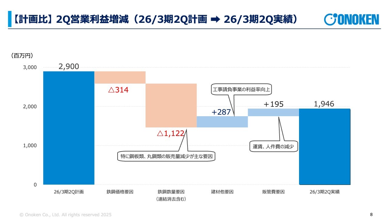 前年同期比および計画比ともに営業利益段階で比較を行っています。先ほどご説明したとおり、鉄鋼商品の販売単価と販売数量の減少が大きく影響し、前年同期比および計画比ともにマイナス要因が拡大しています。