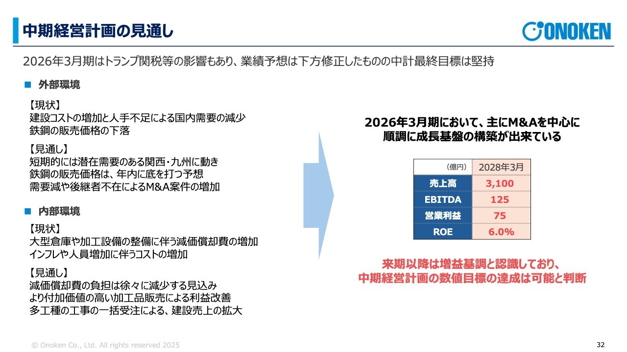 次に、中期経営計画の見通しについてです。先ほど冒頭でお話しした内容と一部重複しますが、この1年はトランプ関税の影響を大きく受け、今年度にもその影響を引きずるかたちとなりました。しかし、実際のところ、先々については非常に明るい展望が見えています。また、我々はその追い風を受けるため、この数年間で大型の設備投資を行ってきました。