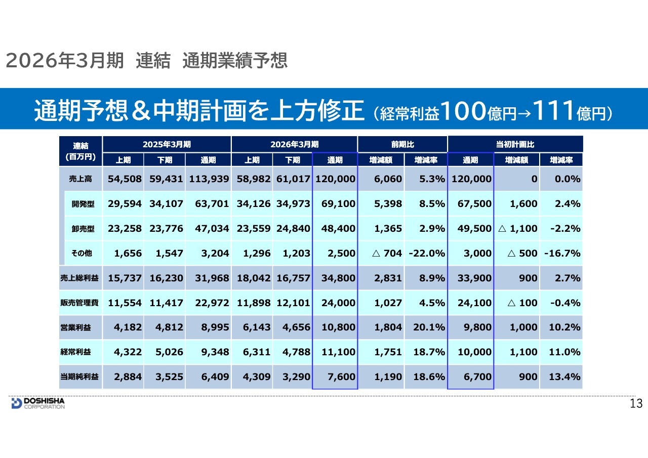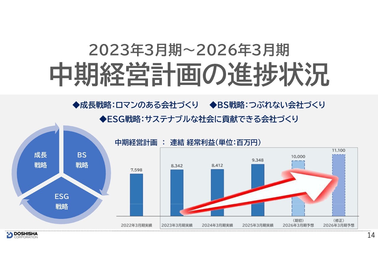 また、今期を最終年度とする中期経営計画の定量目標である連結経常利益100億円も、111億円に変更し、達成に向けて邁進します。