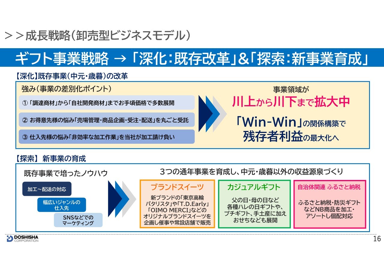 これらの新事業はいずれも、調達から販売までを自社で完結できる体制を基盤に、「深化」で市場を固め、「探索」で成長を目指す両輪で、ギフト事業の拡大を進めています。