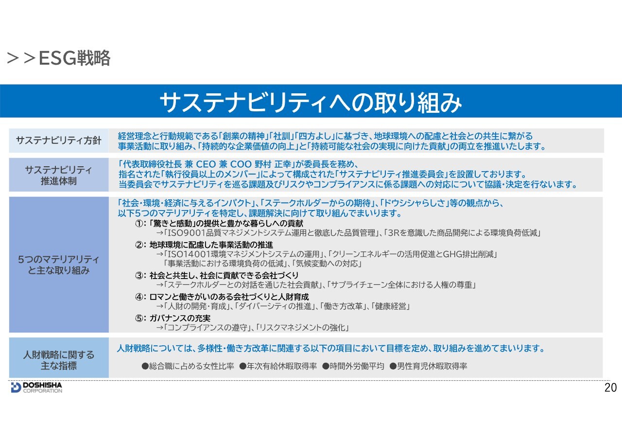 最後に、ESG戦略のサステナビリティの取り組みです。スライドに記載のとおり、「サステナビリティ方針」と「サステナビリティ推進体制」、「5つのマテリアリティと主な取り組み」、「人財戦略に関する主な指標」を設定しています。