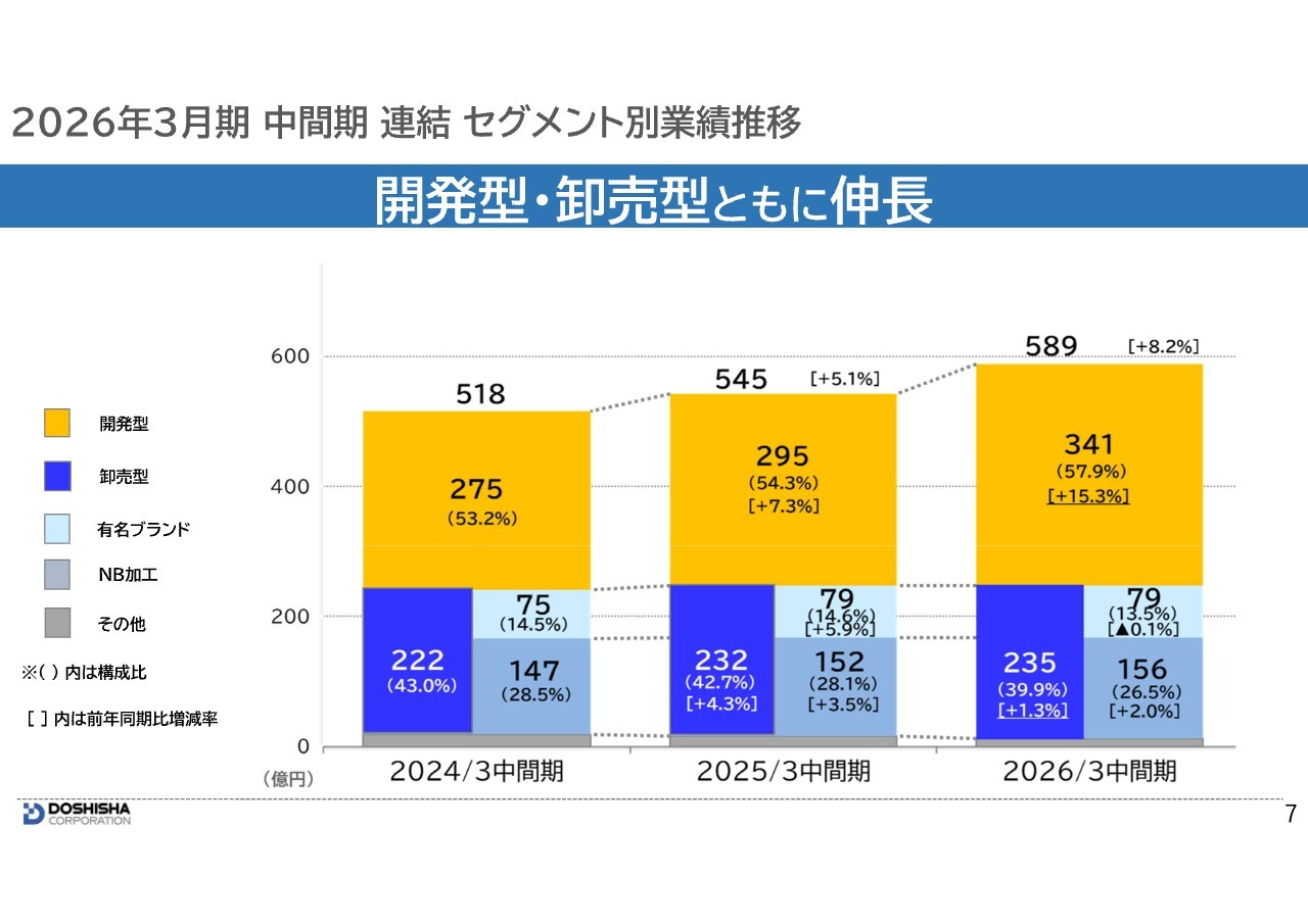 セグメント別の内訳では、開発型は、プラス16.2億円、プラス5.0パーセントの増収になりました。卸売型は、マイナス7.4億円、マイナス3.0パーセントの減収となりました。