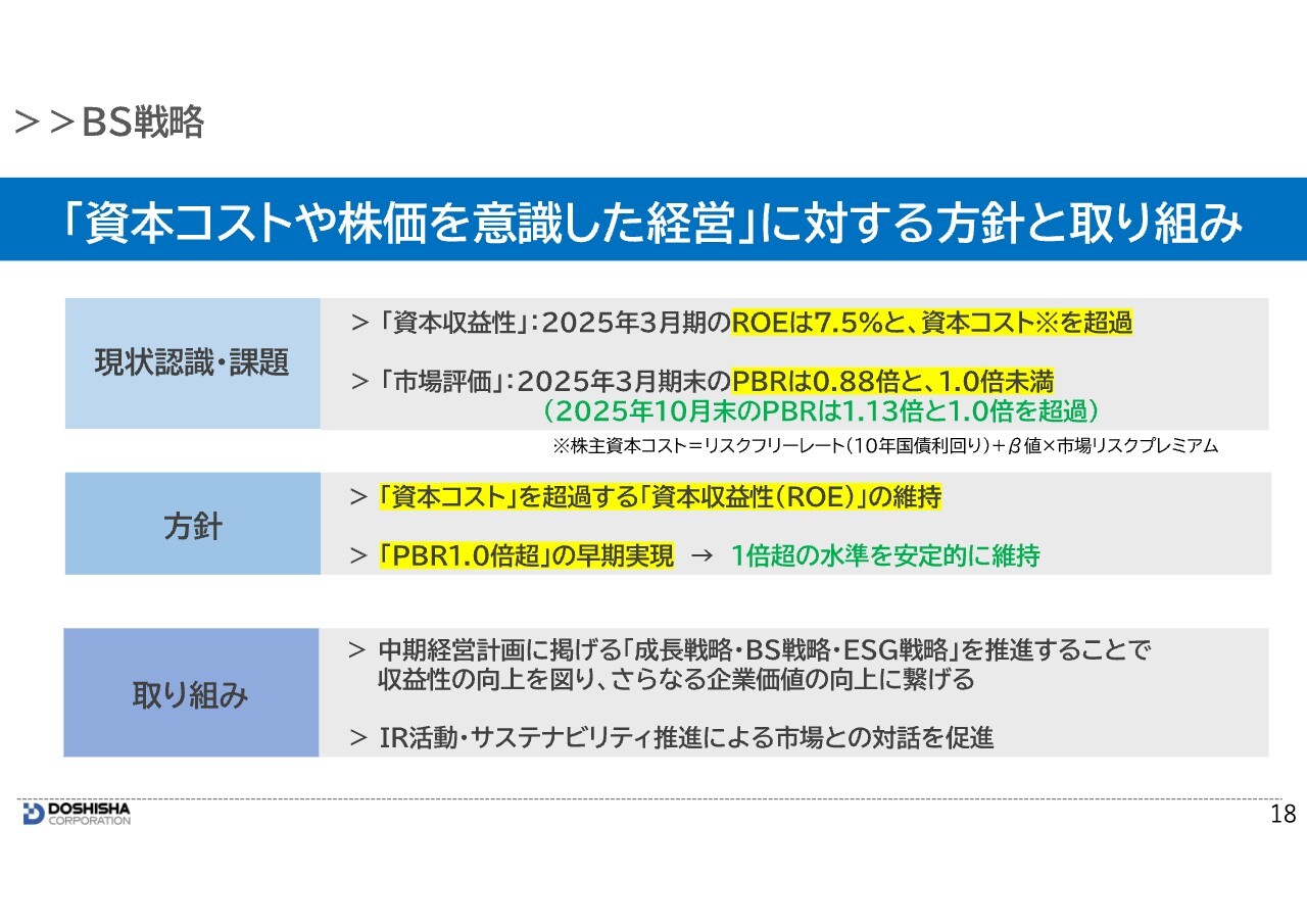 続いて、BS戦略です。「資本コストや株価を意識した経営」に向けた方針と取り組みについてご説明します。