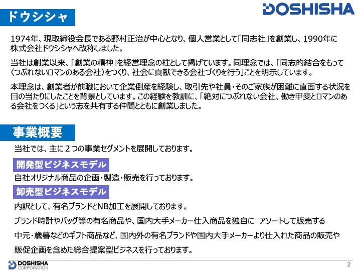 野村正幸氏:みなさま、こんにちは。株式会社ドウシシャ代表取締役社長の野村です。スライドは会社概要となりますので、ご覧ください。