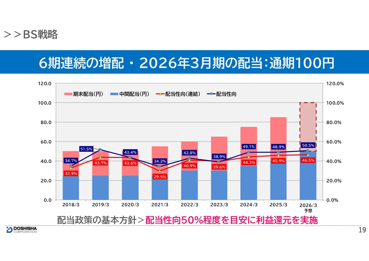 2026年3月期の配当は、5月9日に発表したとおり、中間50円、期末50円の通期100円を予定しており、配当性向は単体50.5パーセント、連結46.5パーセントとなる見通しです。これにより、配当は6期連続で増配となります。