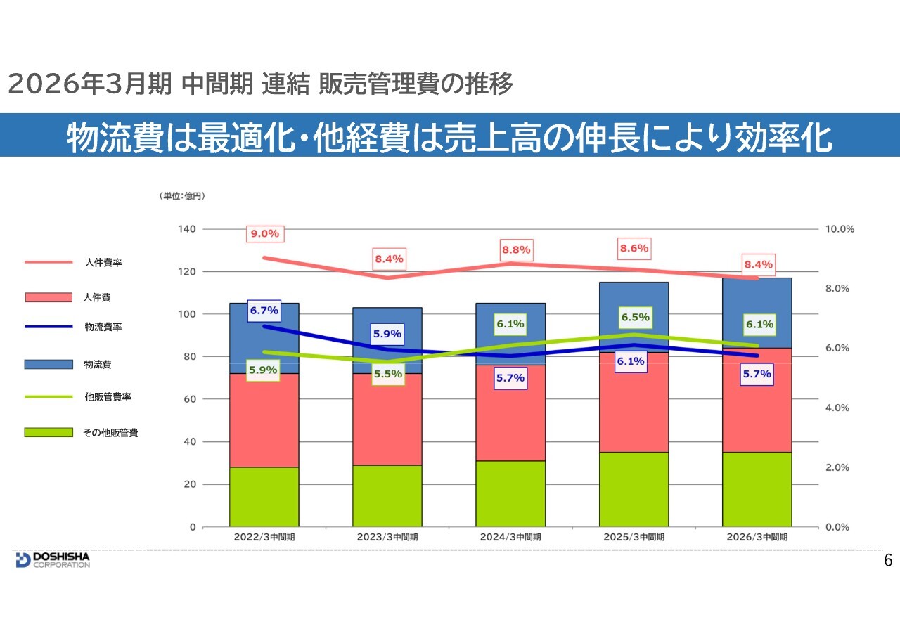 販売管理費の内訳です。まず青色の「物流費率」ですが、物流の最適化・効率化が進み、前年同期より0.4ポイントの改善となりました。
