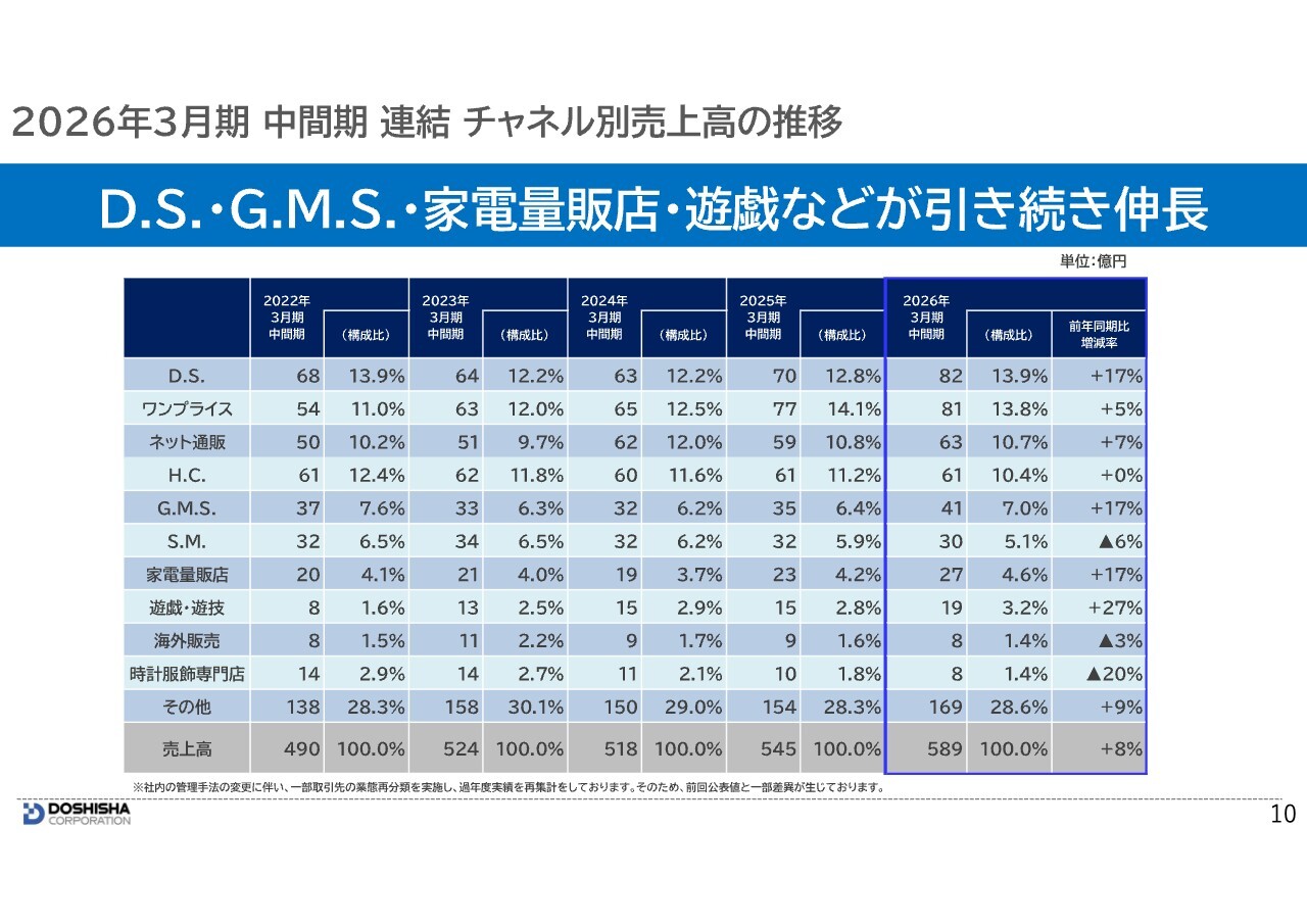 チャネル別の売上高推移です。主に「D.S.(ディスカウントストア)」「G.M.S.」「家電量販店」「遊戯」の業態が、前年同期比で大きく伸長しました。