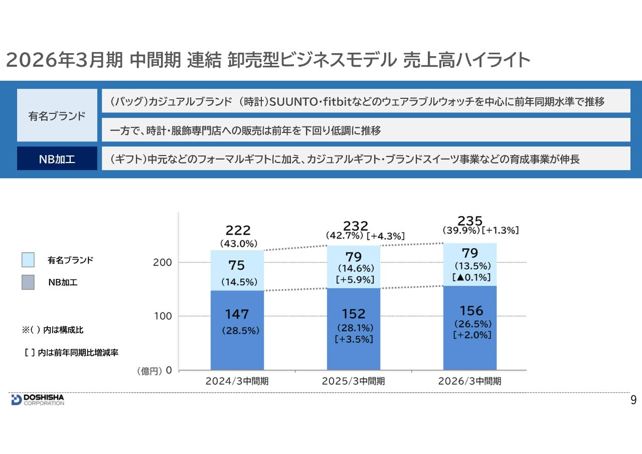 卸売型ビジネスモデルは235億円でプラス1.3パーセントの増収となりました。内訳として、有名ブランドはマイナス0.1パーセントの微減となりましたが、NB加工ではプラス2.0パーセントの増収となりました。