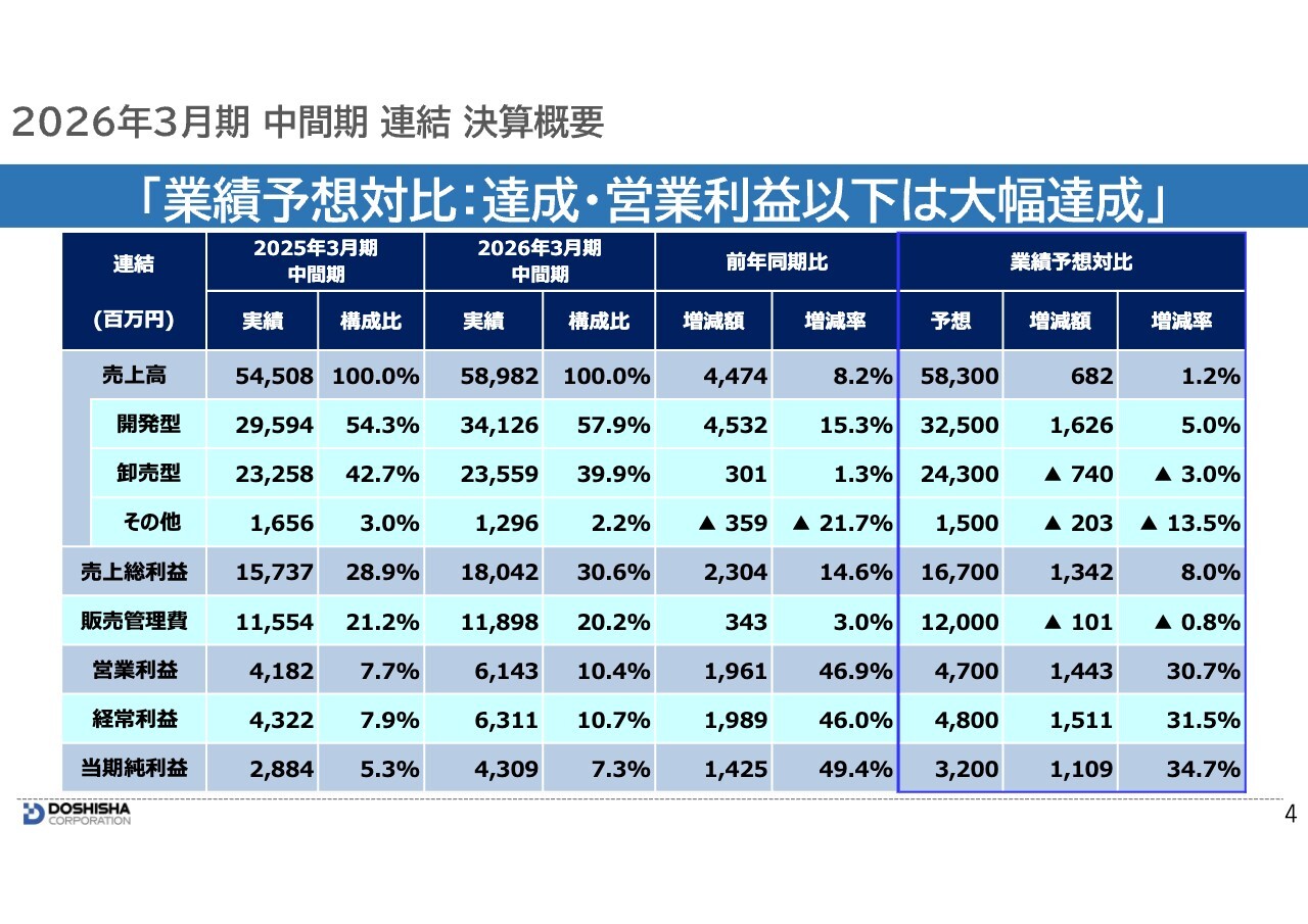 それでは、これより2026年3月期の中間決算をご説明します。最初に2026年3月期中間期の連結決算概要、次に2026年3月期連結通期業績予想の概要と「中期経営計画の進捗状況」をご説明します。