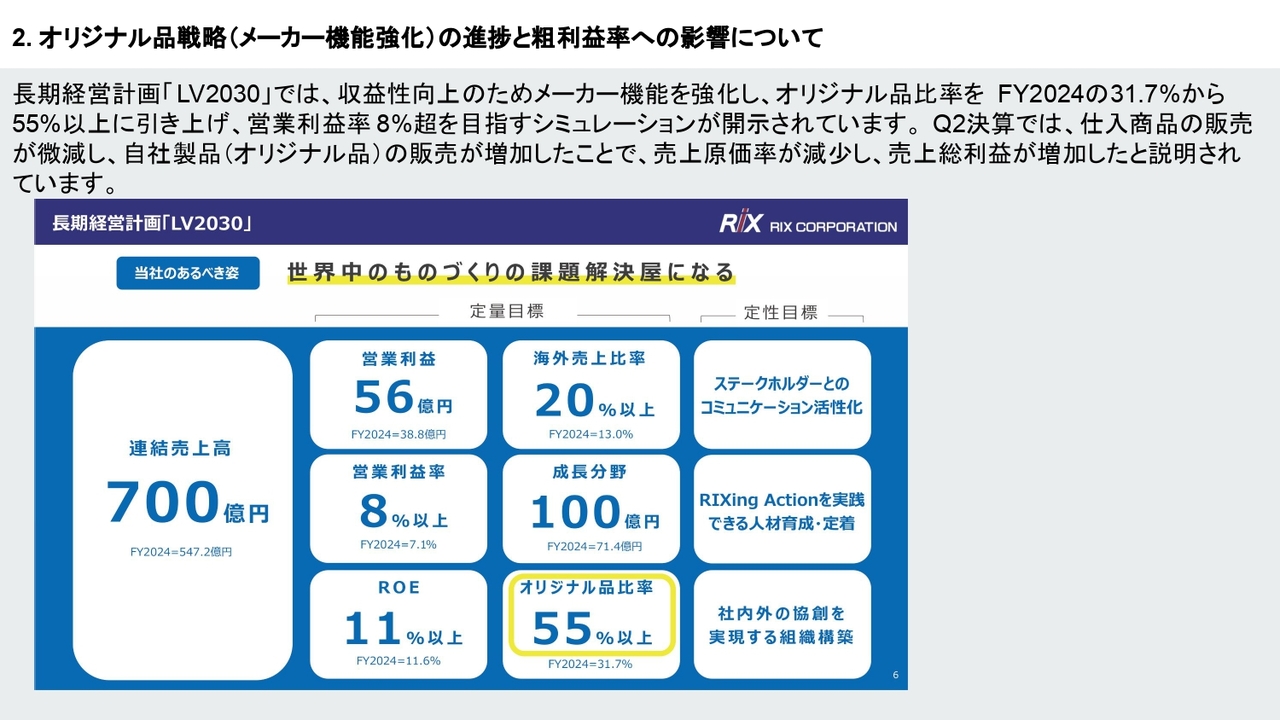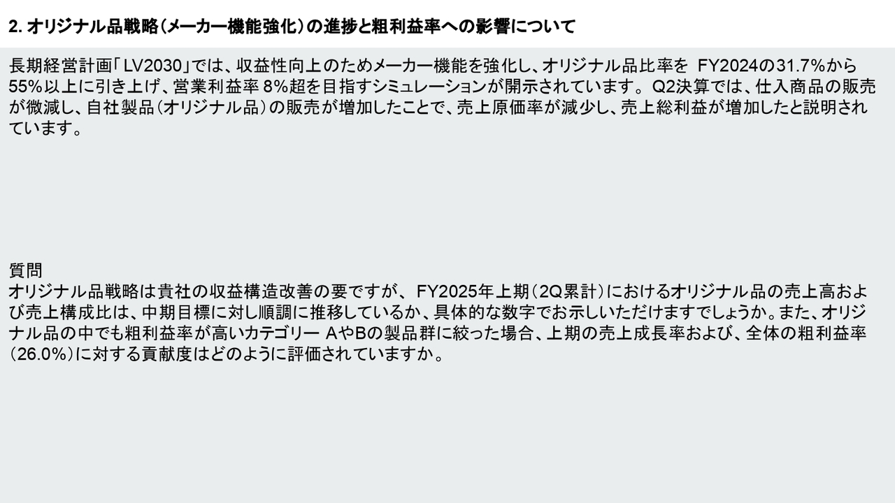 また、今回発表があった2025年第2四半期終了時点でのオリジナル品比率は、中期目標の55パーセントに対して計画どおり順調に推移しているのか教えてください。