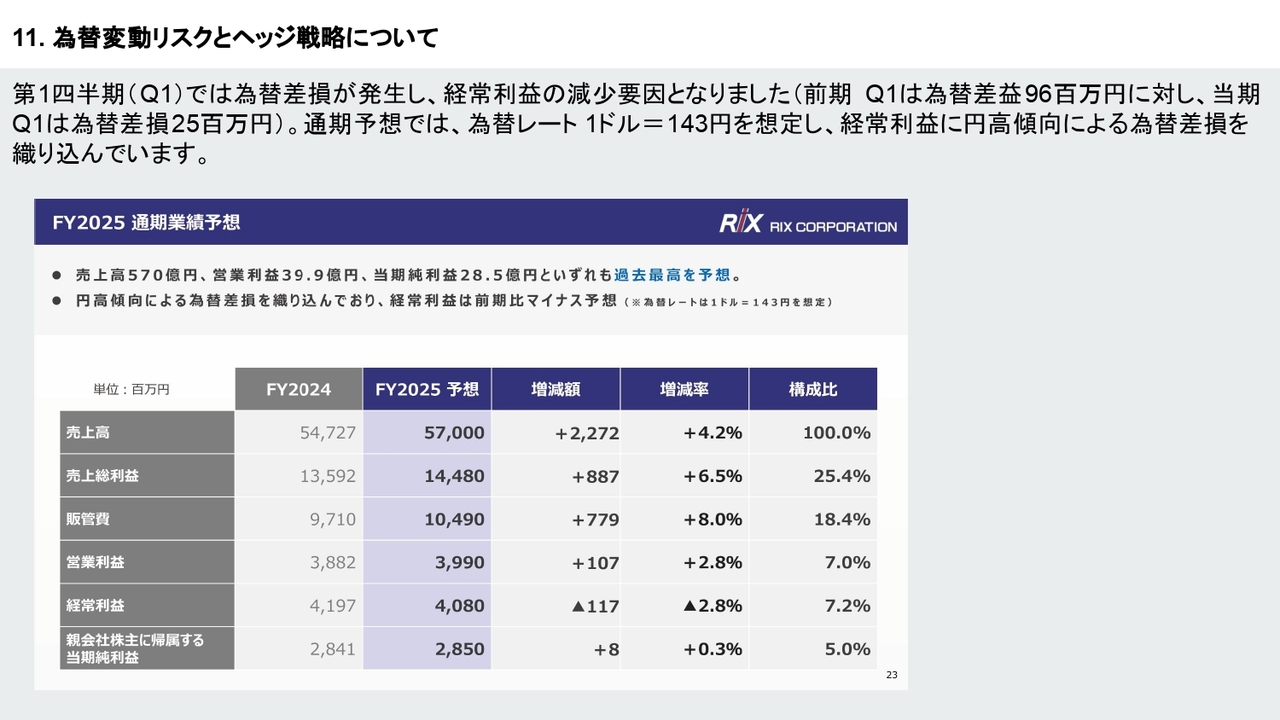 塩谷:為替影響についておうかがいします。御社の今期の想定為替レートは1ドル143円に設定されていると思います。足元の為替水準を見ると、かなり上振れている状態となっていますが、この為替影響については、下期に一定の影響が発生するのでしょうか?