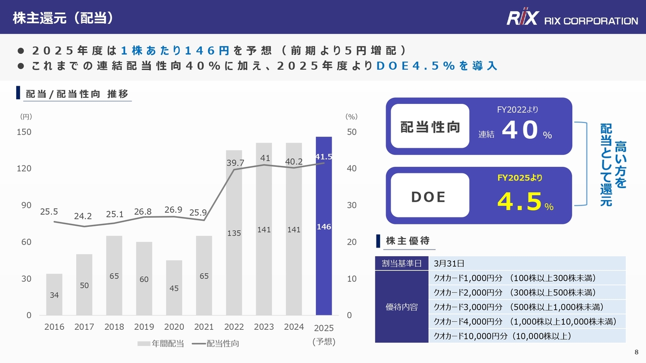 安井:株主還元についてです。配当は上期64円、下期82円の合計146円を予想しています。これまでの連結配当性向40パーセントに加え、今年度よりDOE4.5パーセントも導入しており、いずれか高いほうを配当として還元する方針です。