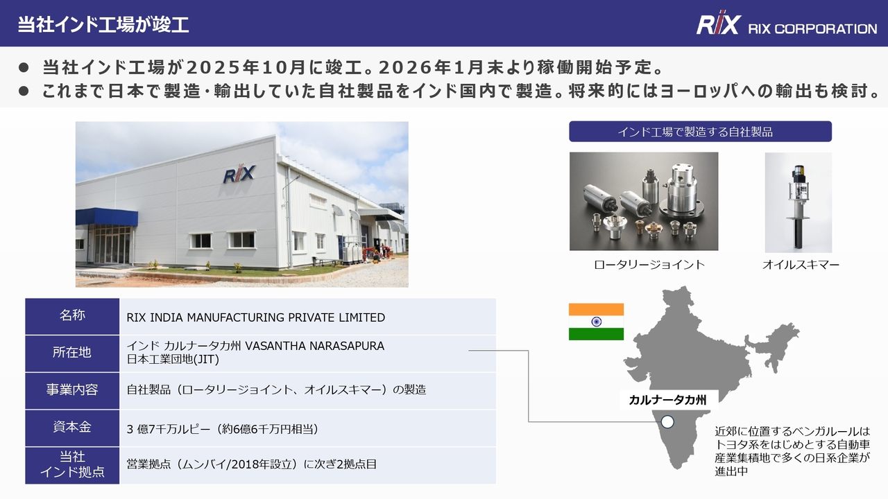 また、スライドには「ムンバイの営業拠点を2018年に設立」と記載がありますが、インドは人口14億人と非常に多いですし、ヨーロッパ向けも含めて工場を増設する計画や、現在の南インドから北インドへの展開予定などがあれば教えてください。