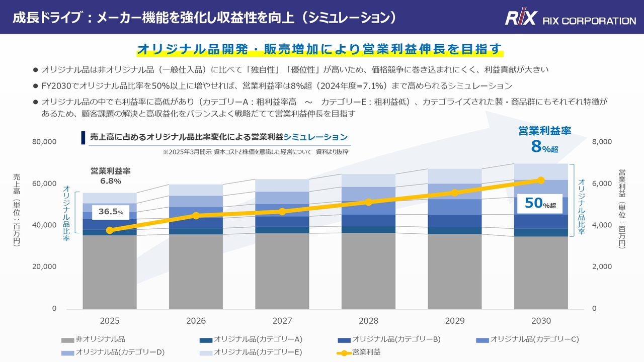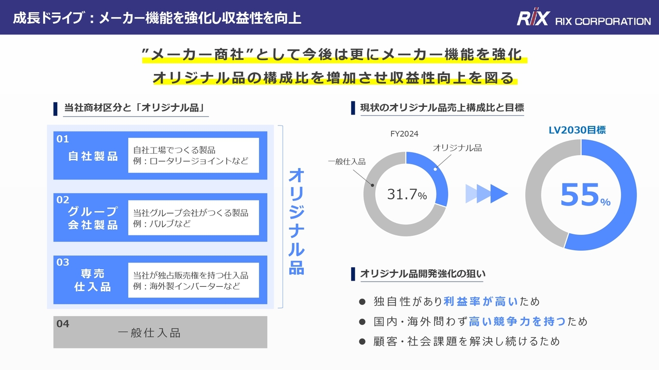 また、リックス協創センターで生まれる新しい商材についても、オリジナル品としてカウントできると考えています。新たな商材が生まれ、それが事業化されていくことも期待しており、その楽観的な見通しを含め、オリジナル品比率を半分以上にすることを目標に、55パーセントと設定しています。