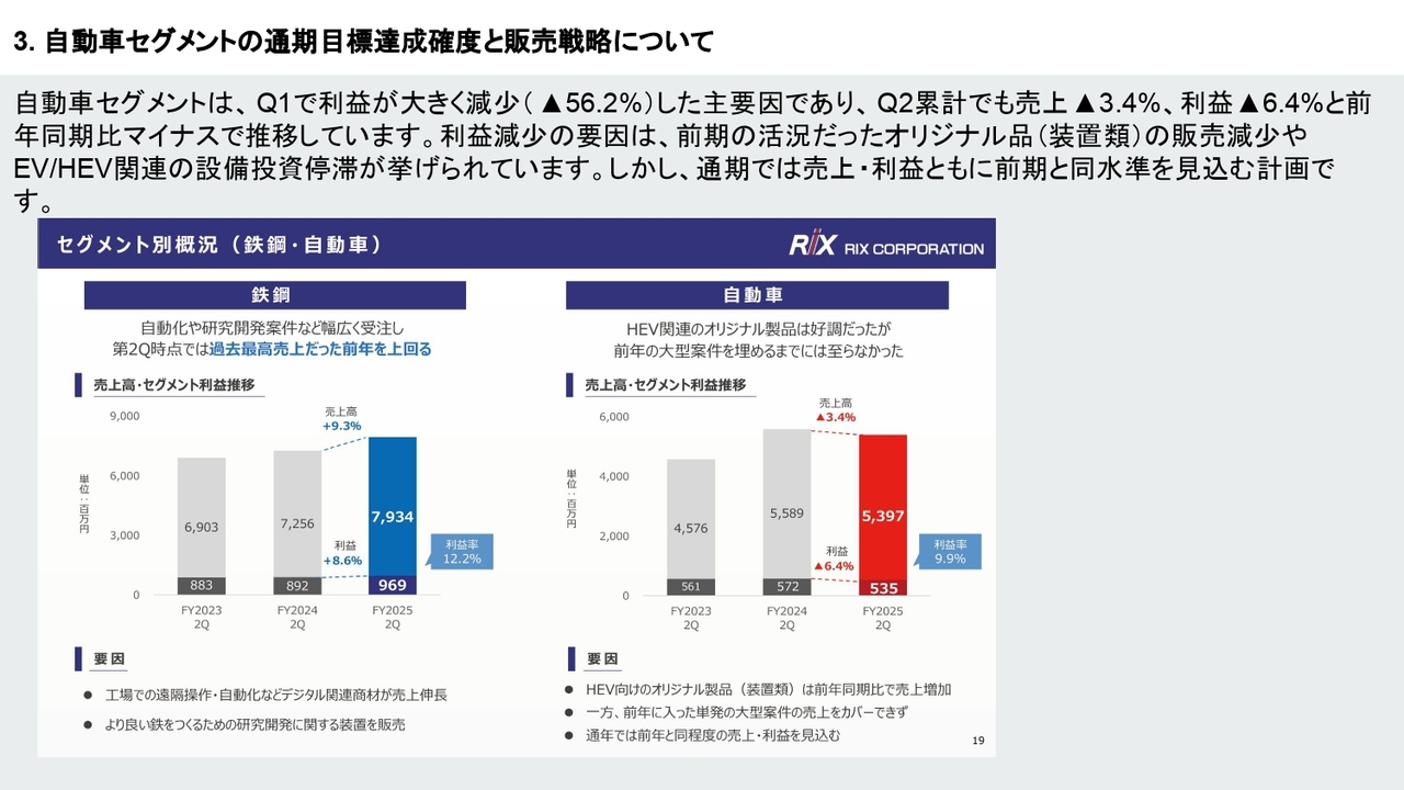 安井:自動車セグメントについてですが、特に第1四半期は関税率がなかなか決まらず、お客さまが投資のタイミングを見計らっている状況だったと考えています。このような要因で伸び悩みましたが、第2四半期以降は少しずつ回復しています。現在の期末予想も、特に見直す必要はないと考えていますので、下期は期待していただければと思います。