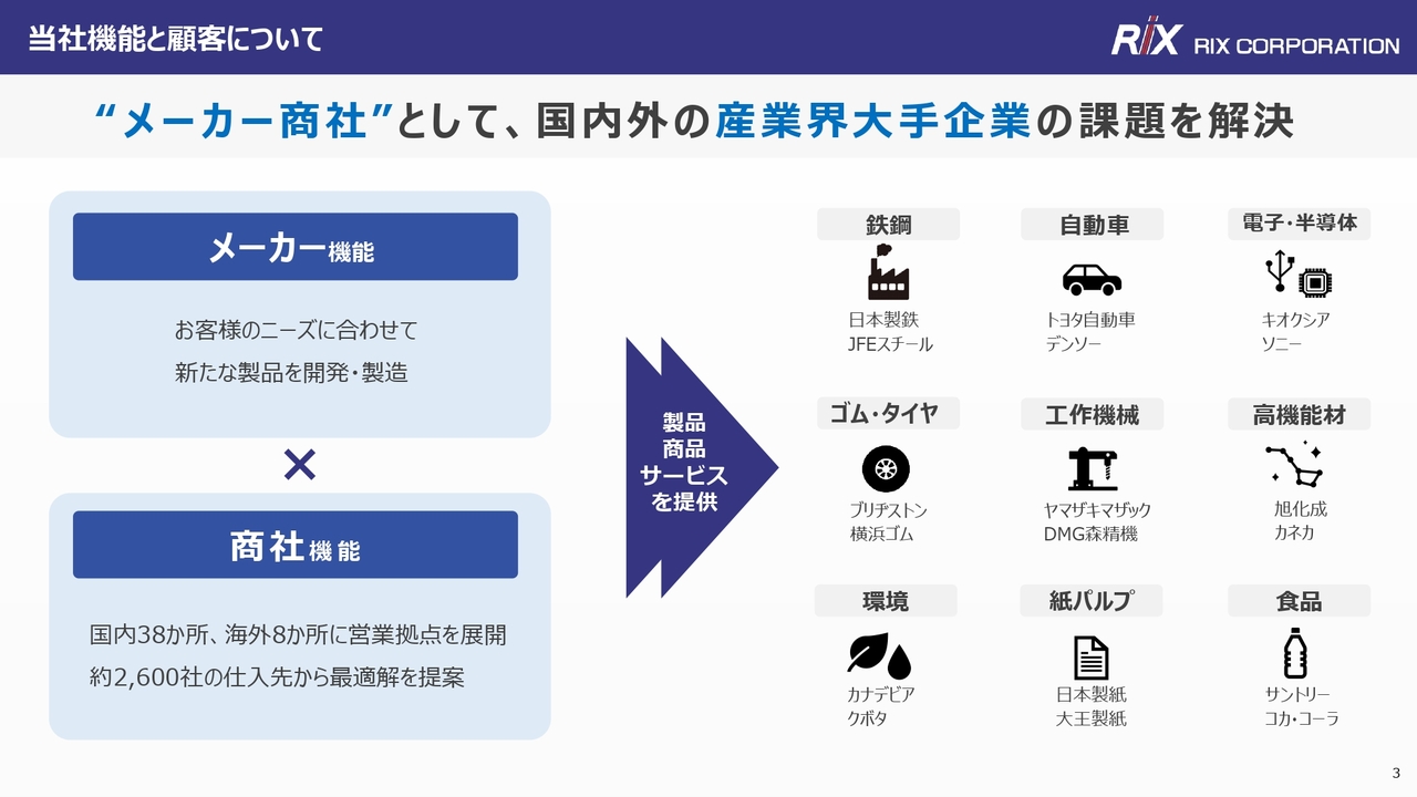 スライド右側に記載のとおり、お客さまは国内外の産業界の大手企業が中心です。鉄鋼業界では日本製鉄、自動車業界ではトヨタ自動車、電子・半導体業界ではキオクシアなど、ものづくりの各分野でトップメーカーとの取引があります。