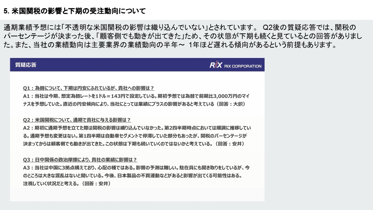 質疑応答:上期の関税影響と下期以降の受注動向について