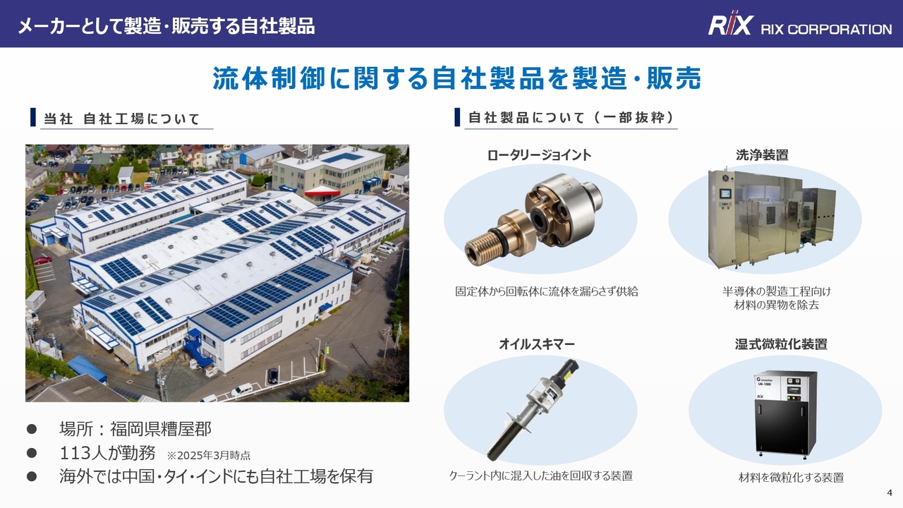 安井:当社はメーカー部門として、福岡県糟屋郡に自社製品を製造する工場を保有し、設計・開発・製造などに取り組んでいます。この工場では、自社製品としてロータリージョイント、洗浄装置、オイルスキマーなど、流体制御に関わる製品を開発しています。これらはなかなか見慣れない製品かもしれませんが、どれもものづくりには欠かせない商品となっています。