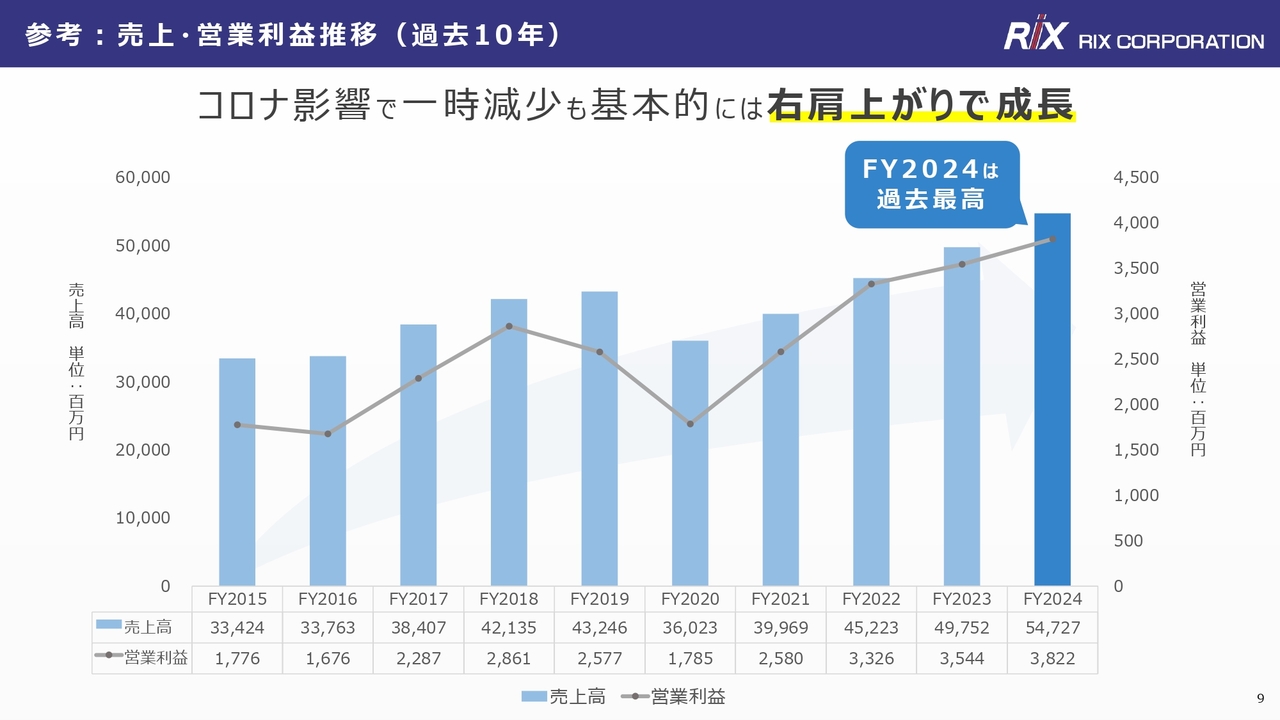 安井:スライドのグラフは、ご参考までに、直近10年間の売上高・営業利益の推移を示しています。新型コロナウイルスの影響で一時的に減少しましたが、基本的には右肩上がりで成長しており、2024年度には過去最高の業績を達成しています。