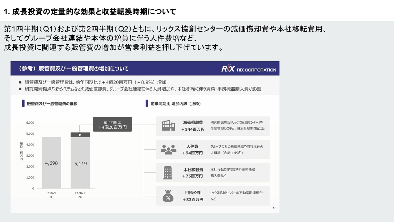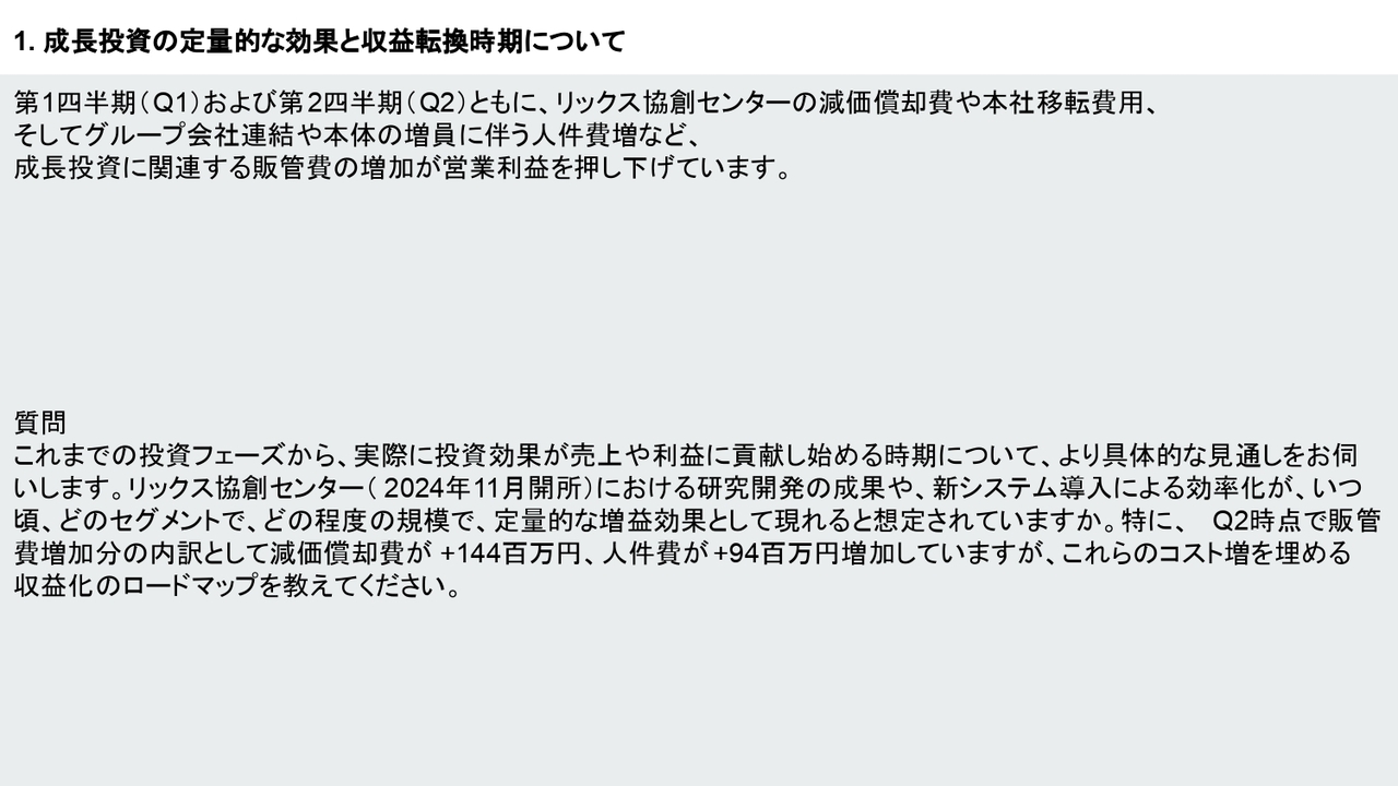塩谷:本年度の第1四半期および第2四半期における費用については、リックス協創センターの減価償却費や本社移転費、それに伴う採用費などにより、例年よりも少し増加していると認識していますが、今年行っている投資はどの程度効果があるのでしょうか?