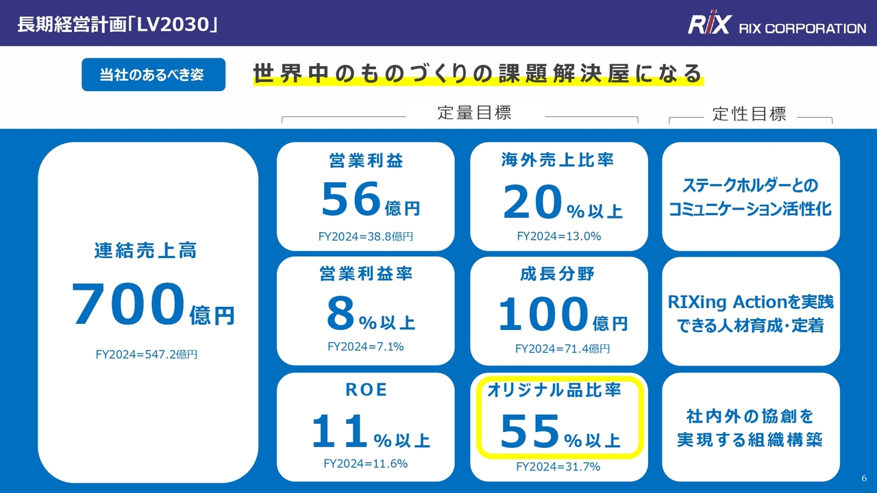 まず、2030年度までの長期経営計画についてです。売上高は現在の約1.3倍となる700億円、営業利益は約1.4倍の56億円を目標としています。これらの目標を達成し、持続的な成長を実現するためのドライバーとして、オリジナル品の開発を掲げています。