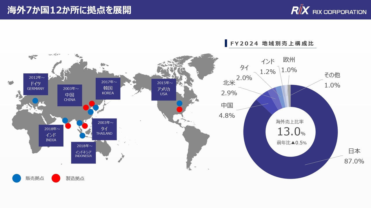 大鉙:現時点の海外売上比率はおおよそ13パーセントです。例えば、中国ではロータリージョイントを製造する会社や洗浄装置を製造する会社があり、また、タイにも洗浄装置を製造する会社があります。これらのエリアについてはその地域で対応しています。