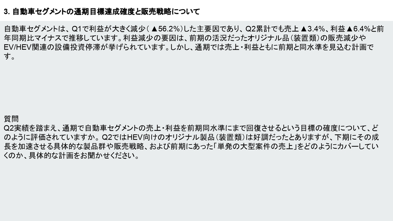 安井:自動車セグメントについては、第2四半期でも回復が見られます。また、営業部門から集めた見込み情報によると、今期において特段の下振れ要因は現時点ではないと認識しています。