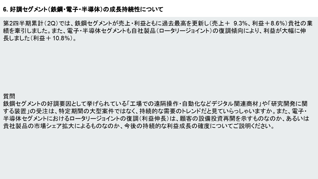 塩谷:今期上期で特に目立ったのは、鉄鋼セグメントの好調です。要因として、工場での遠隔操作や自動化に関連するデジタル商材、そして研究開発に関連する装置などが挙げられていましたが、これらは今期限りの特殊要因的な需要なのでしょうか? それとも、来年度や再来年度も続く、いわゆる工場の無人化のような広いテーマなのだろうと思いますが、このテーマの持続性についてどのようにお考えですか?