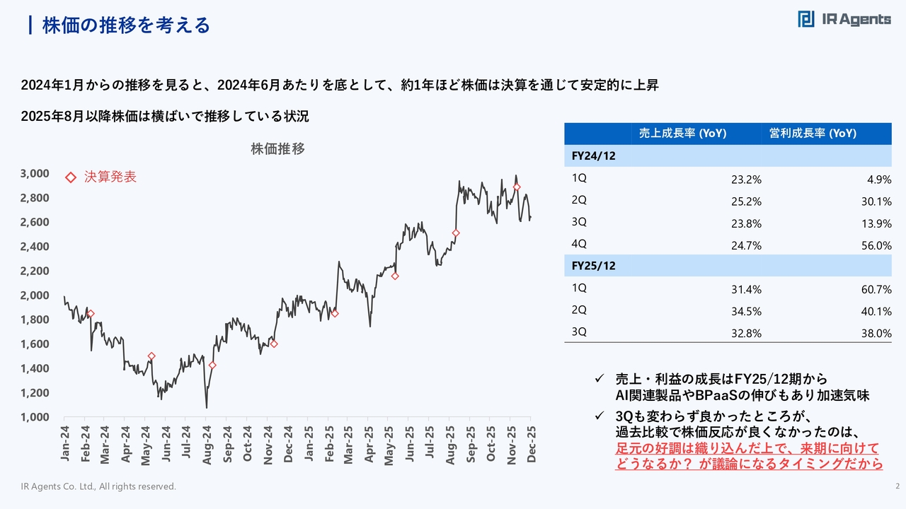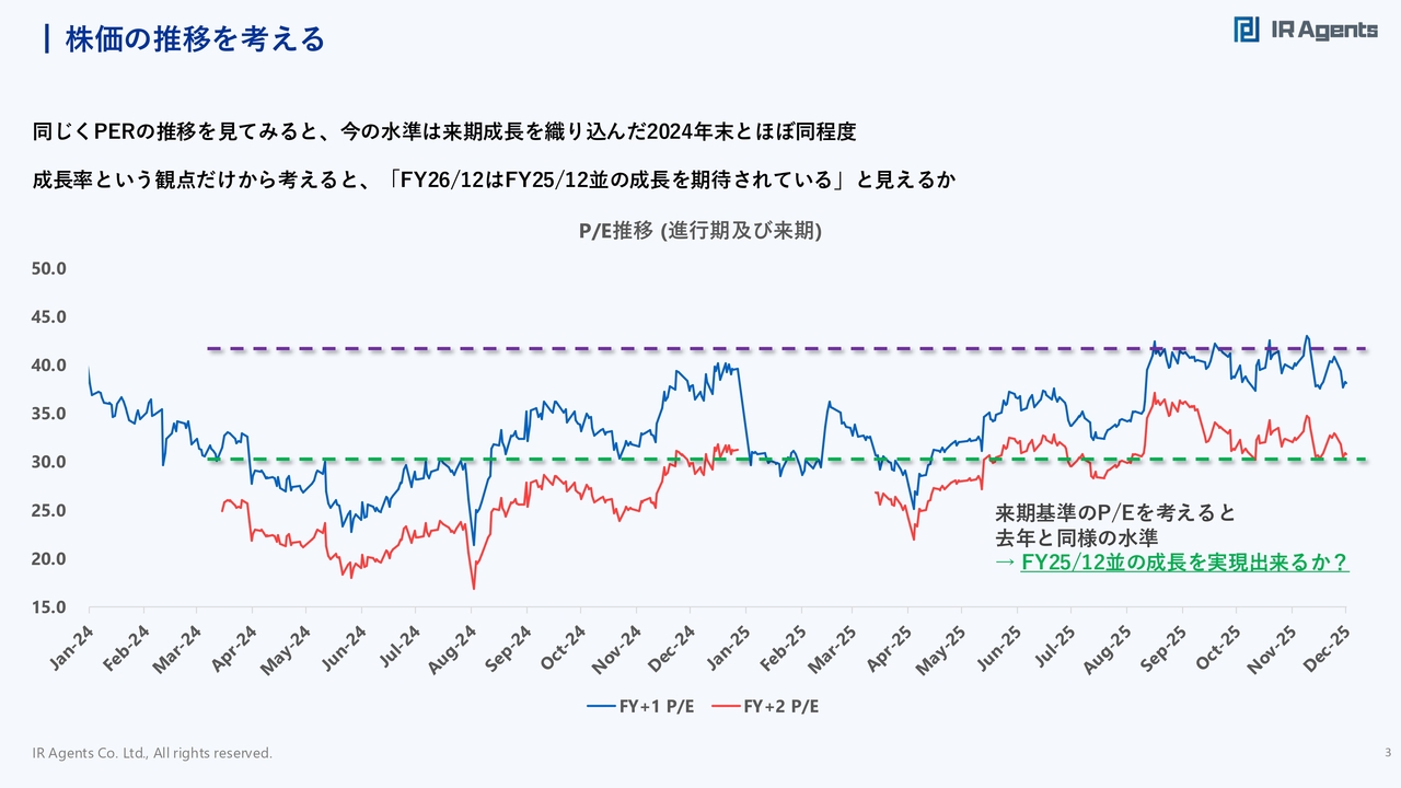 おおよそ昨年、2024年12月頃の来期のPERが30倍程度であり、現在も同程度の水準となっています。このことから、今期の売上が30パーセント増、利益率が40パーセントから50パーセントと非常に高い成長を遂げているものの、成長率という観点だけを見ると、「2026年12月期に2025年12月期並みの成長を実現できるのか?」ということが市場から問われているのではないかと考えています。