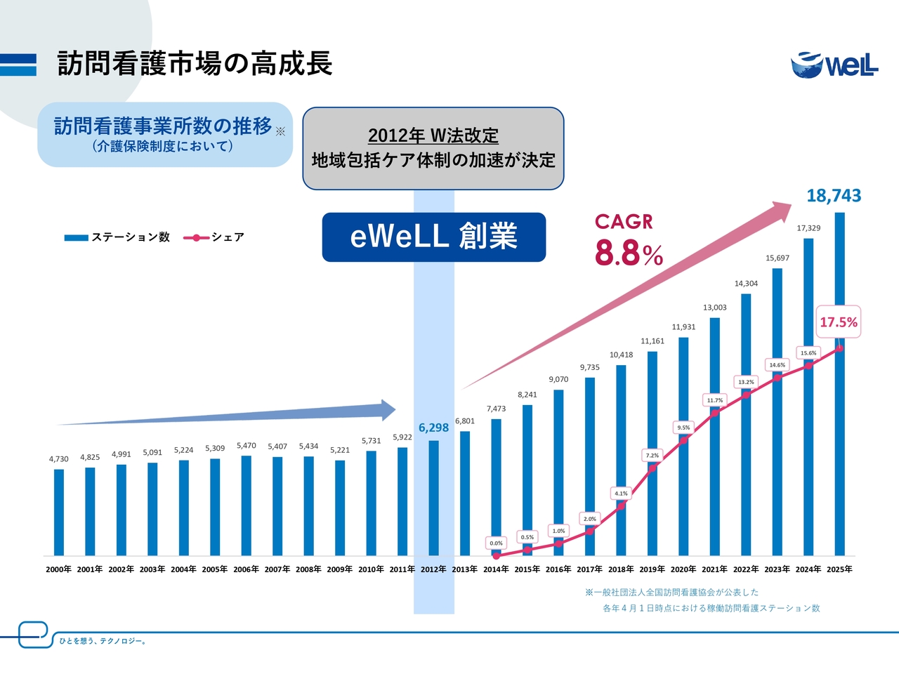 このように重要な役割を果たす訪問看護が現状どうなっているかというと、私たちは2012年に起業して以来約13年が経過しましたが、その間、訪問看護ステーションの数は約6,000ステーションから1万8,743ステーションにまで増加しており、現在でも拡大傾向にあります。