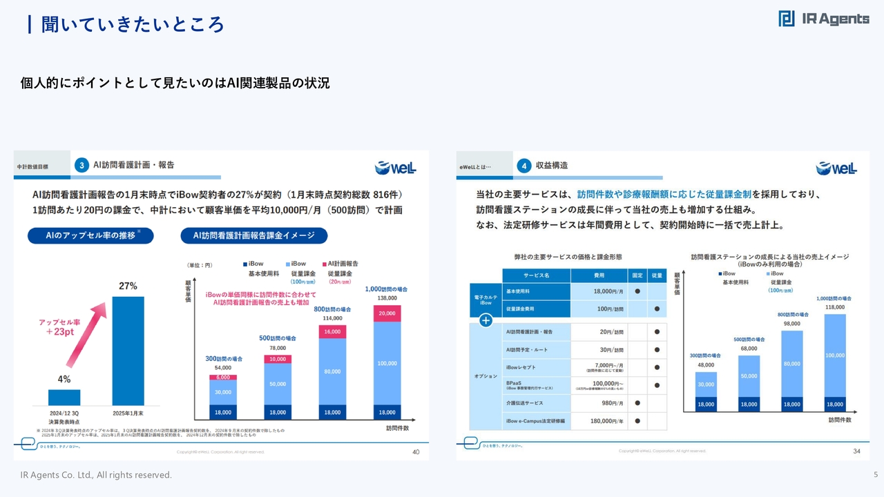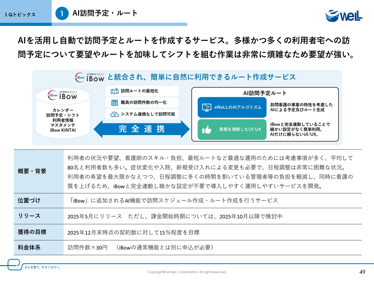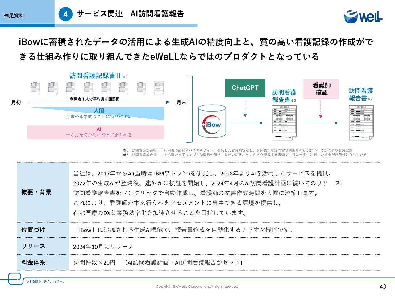 関本:最後に、今期についてですが、AIが単価の上昇にかなり寄与している印象があります。現在展開している訪問看護計画報告やAIルートに関して、お客さまからの評価や、来期に向けた展望についてどのように考えていますか?