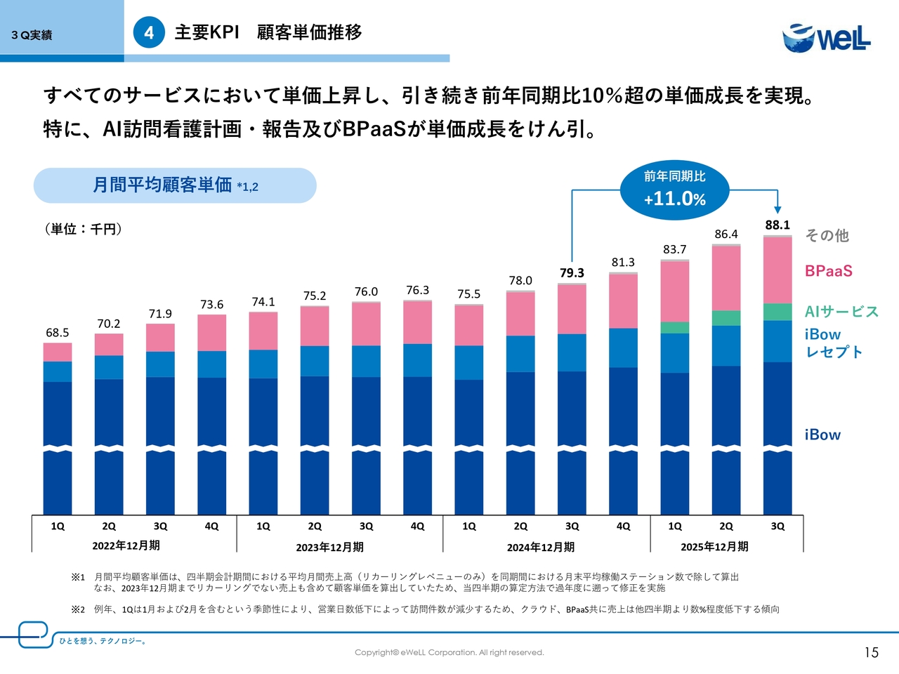 これは参考値としてご承知ください。ただし、新規契約を多数獲得すると一時的に下がる可能性もあるため、完全には頼りにしないほうがよいかもしれません。しかし現在のところ、ミドルクラスの訪問看護ステーションの契約が順調に獲得できており、単価も上昇しています。また、仮に単価の低い新規契約を獲得して一時的に数値が毀損したとしても、訪問看護ステーションが事業を継続するうちに、1年、2年、3年と利用が進むごとに訪問件数は増加するため、結果的に単価に寄与していきます。