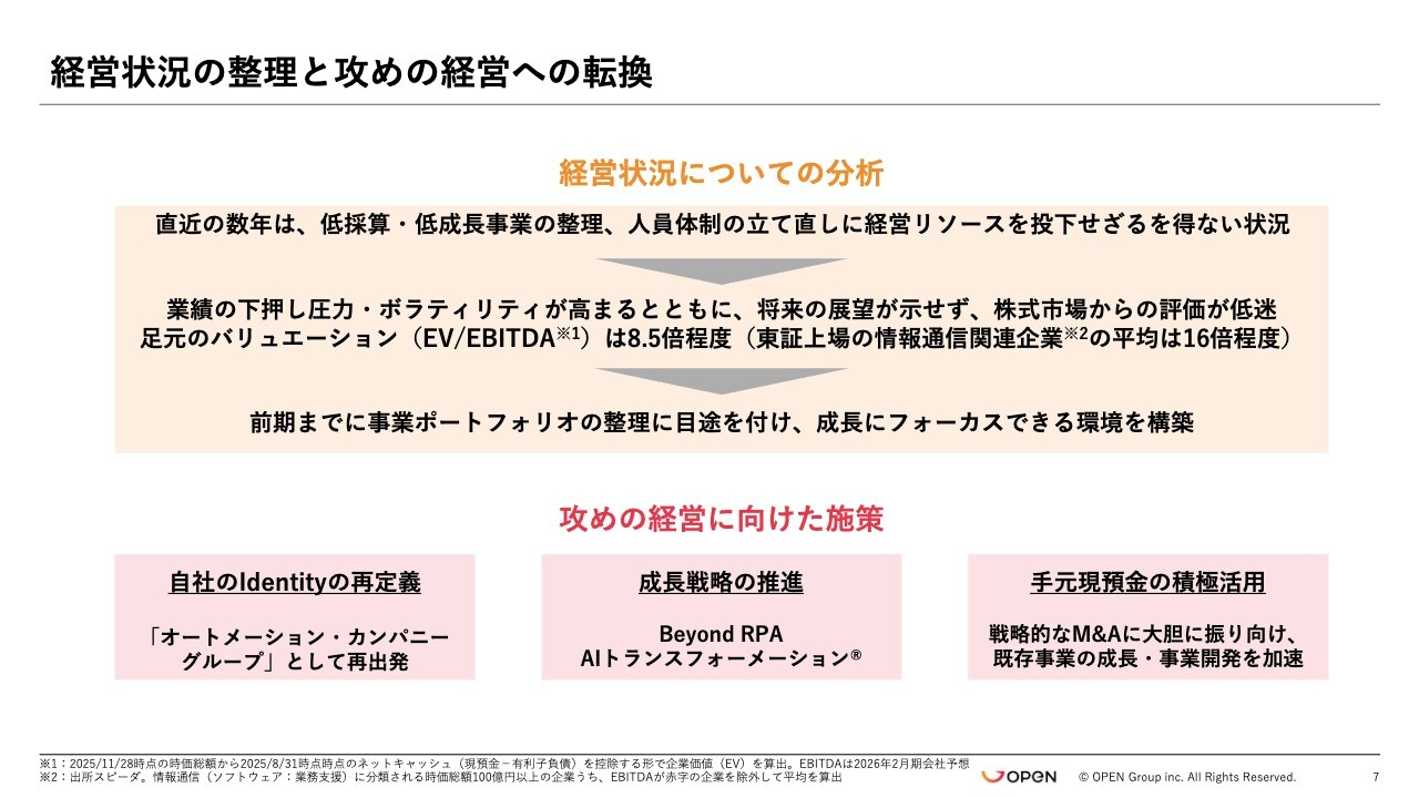 それを受けて、攻めの経営としてスライドに3つのポイントを挙げています。1つ目は「自社のIdentityの再定義」です。前期にCI(コーポレートアイデンティティ)を実施し、オートメーション・カンパニーグループとして事業の再編を行いました。これにより現在の中核事業会社であるオープンに事業を集約し、シナジーと効率化を図る取り組みを進めています。