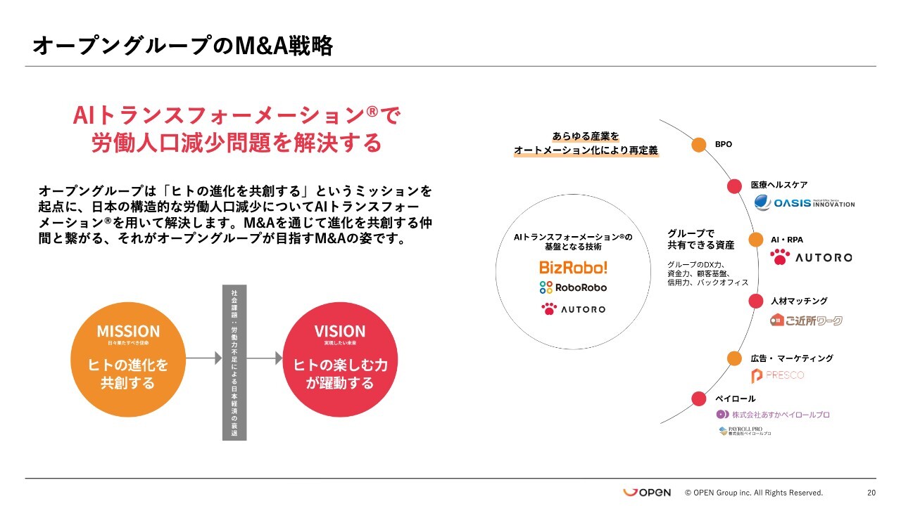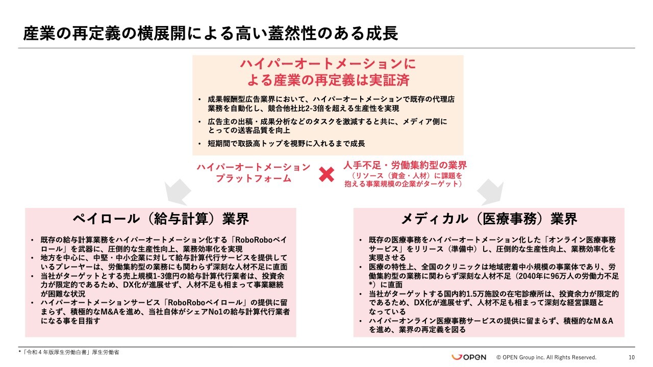 当社が中核としているハイパーオートメーション技術をさらに磨くだけでなく、給与計算、医療、広告も含めてさまざまな分野に拡大していくように、積極的にM&Aを進めていく方針です。