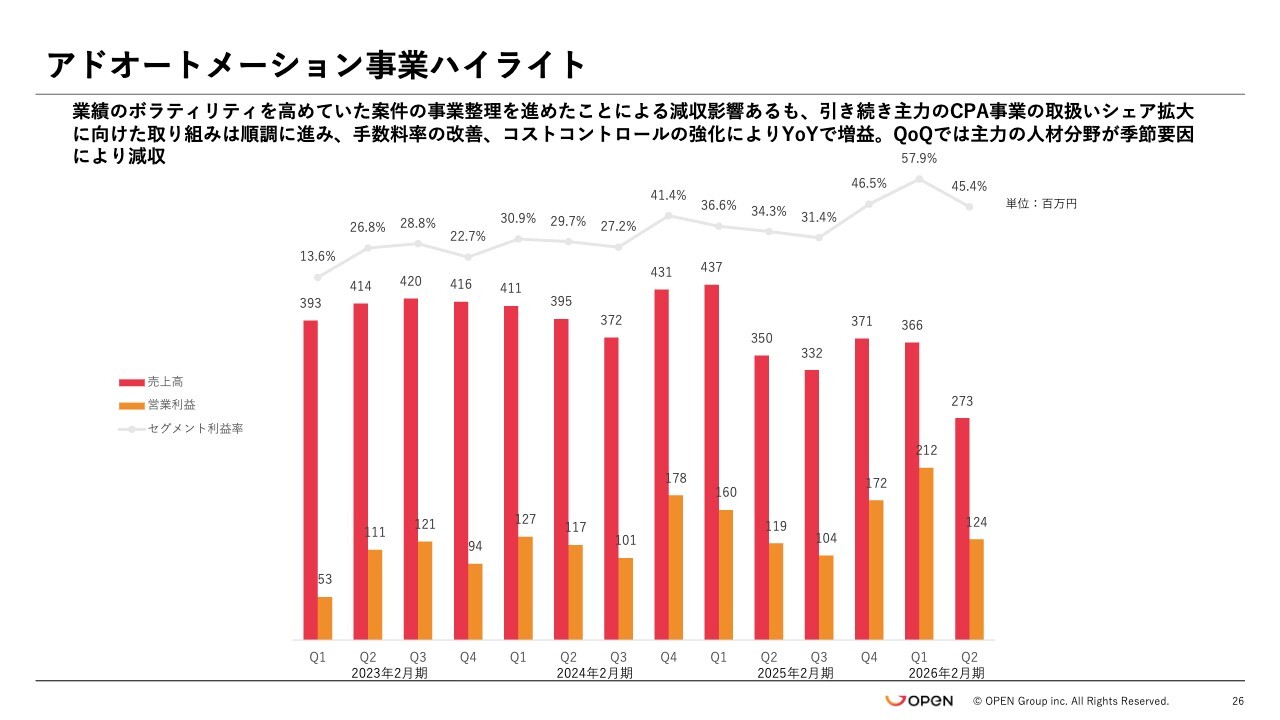 高橋:アドオートメーション事業については、冒頭にご説明した業績のボラティリティを高めていた事業の整理の影響がまだ多少残っており、現在もブレがある状況です。しかし、取扱シェアは着実に拡大しています。