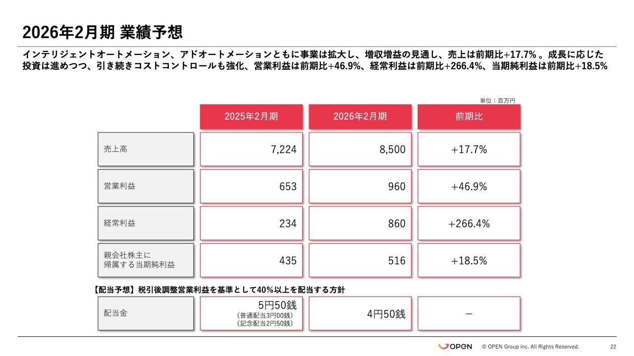 高橋:2026年2月期の業績予想を簡単に振り返ります。売上高は前期比17.7パーセント増の85億円です。また、親会社株主に帰属する当期純利益は、前期比18.5パーセント増の5億1,600万円を計画しています。