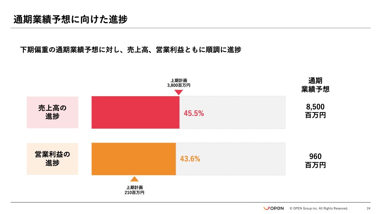 高橋:通期の進捗状況は、売上高は45.5パーセント、営業利益は43.6パーセントの進捗で、上期の計画に対して上振れして推移している状況です。